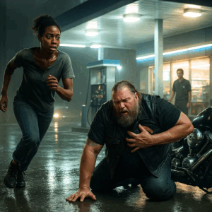 She turned toward the far edge of the lot. A huge figure—broad-shouldered, bearded, dressed in leather—stumbled beside a chrome motorcycle. His vest was patched with skulls and red letters that glared under the buzzing lights: HELL’S ANGELS. He fell to one knee, then another, and finally collapsed on the pavement. His hand clawed at his chest.