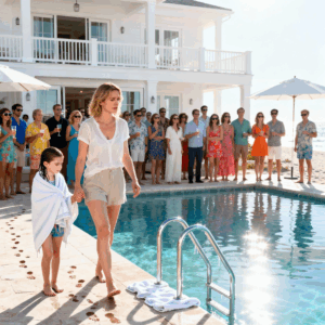I simply wrapped my kids in towels—one towel dotted with yellow ducks, the other with faded superheroes. Each wet footprint they left on the stone felt like a bruise I would remember for the rest of my life. We walked out of that “perfect” pool party in silence, my daughter’s hair slicked back like someone had smoothed it with grief, my son’s fingers locked around my hand.