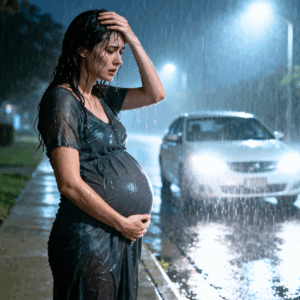 She didn’t have an umbrella, or a coat, or even shoes that made sense in this weather—just flats soaked through with mud. Her long hair clung to her face, and she looked like she could collapse at any second.